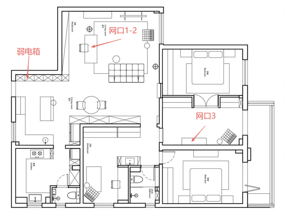网口3位于阳台旁边的书房,户型面积为120平米,粉丝要求家里能跑满1000m宽带。