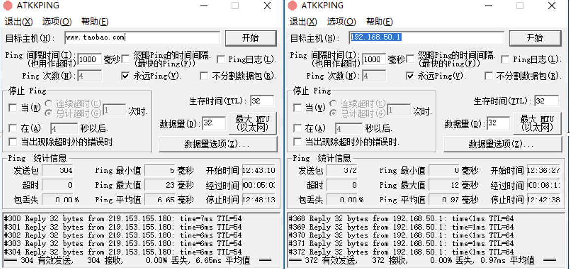 在PC上通过专业的软件ATKKKING进行了5分钟的内外网测试如上图