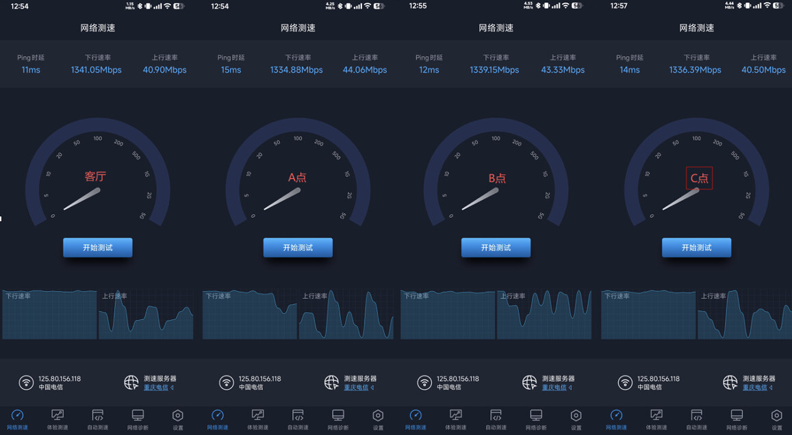 从四个点位的测速图(客厅、A 点、B 点、C 点)可以看到: