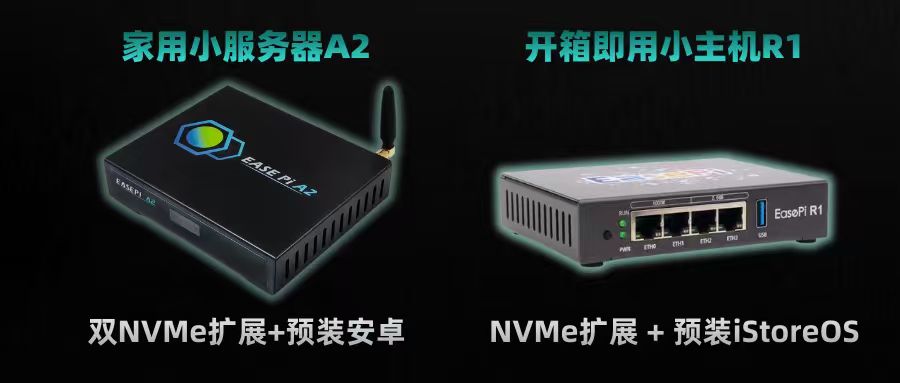 - EasePi‑A2:Android 默认(支持 Docker;可刷 iStoreOS/Armbian/One‑KVM),双 NVMe 高速存储,适合媒体播放与小型服务器。