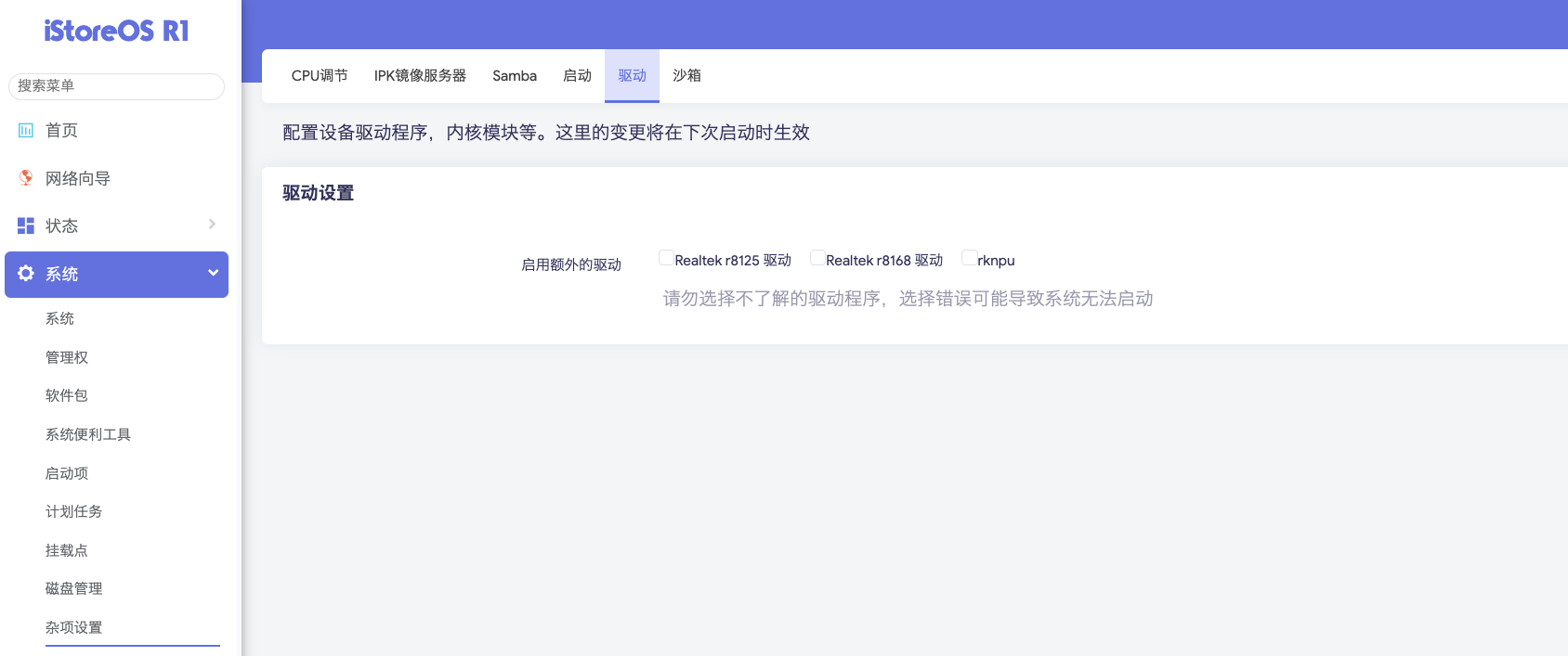- Rockchip 系列:集成 r8125 和 r8168 可选驱动,在 系统-杂项设置-驱动 中可管理。注意,如果之前在软件包中安装过 kmod-r8125 或 kmod-r8168 ,或者卸载过 kmod-r8169 ,那么升级前先“修复系统软件”(从 iStore 中安装“系统便利工具”1.0.17或以上版本),以免驱动不按预期加载导致后台都进不去(至少要有 kmod-r8169 兜底)。(r8125 驱动支持 2.5G 网卡,r8168 驱动支持 Nanopi R4S 或 RK35xx 系列上的 PCIE 千兆网卡)