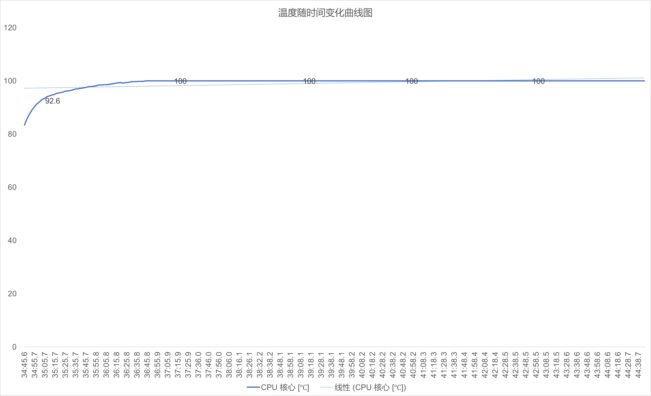 ▲由于 Thermal Limit(热限制)设定在 100℃,整个 Stress FPU 阶段 CPU 温度经初始快速上升后,全程稳定在 100℃以内,未出现超温情况。