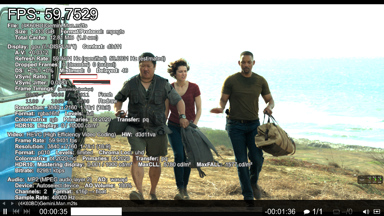 ▲hevc编码4k 60fps视频播放测试,播放流畅,帧率59.7FPS。