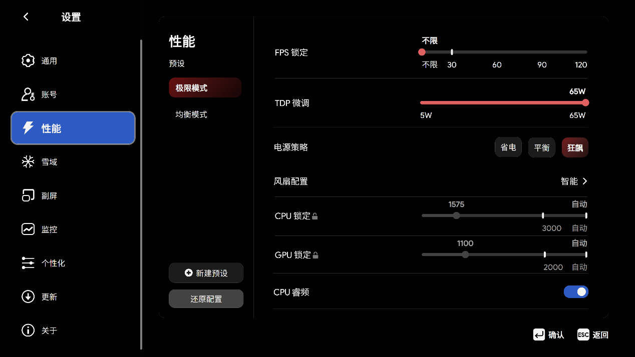▲性能选项中分别有不同的TDP策略,也可以自己新建预设,根据自己的需求设定。