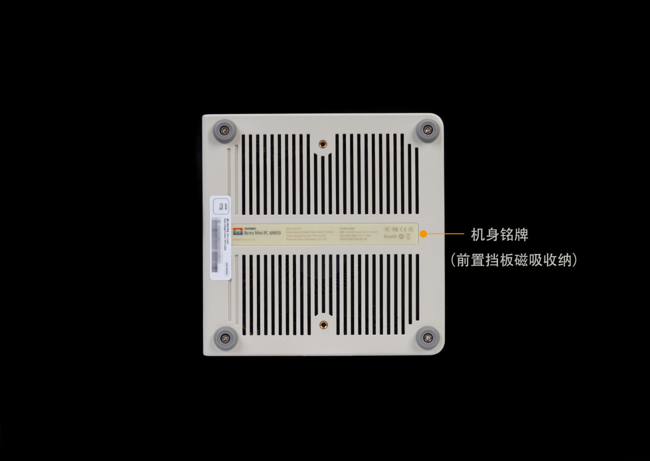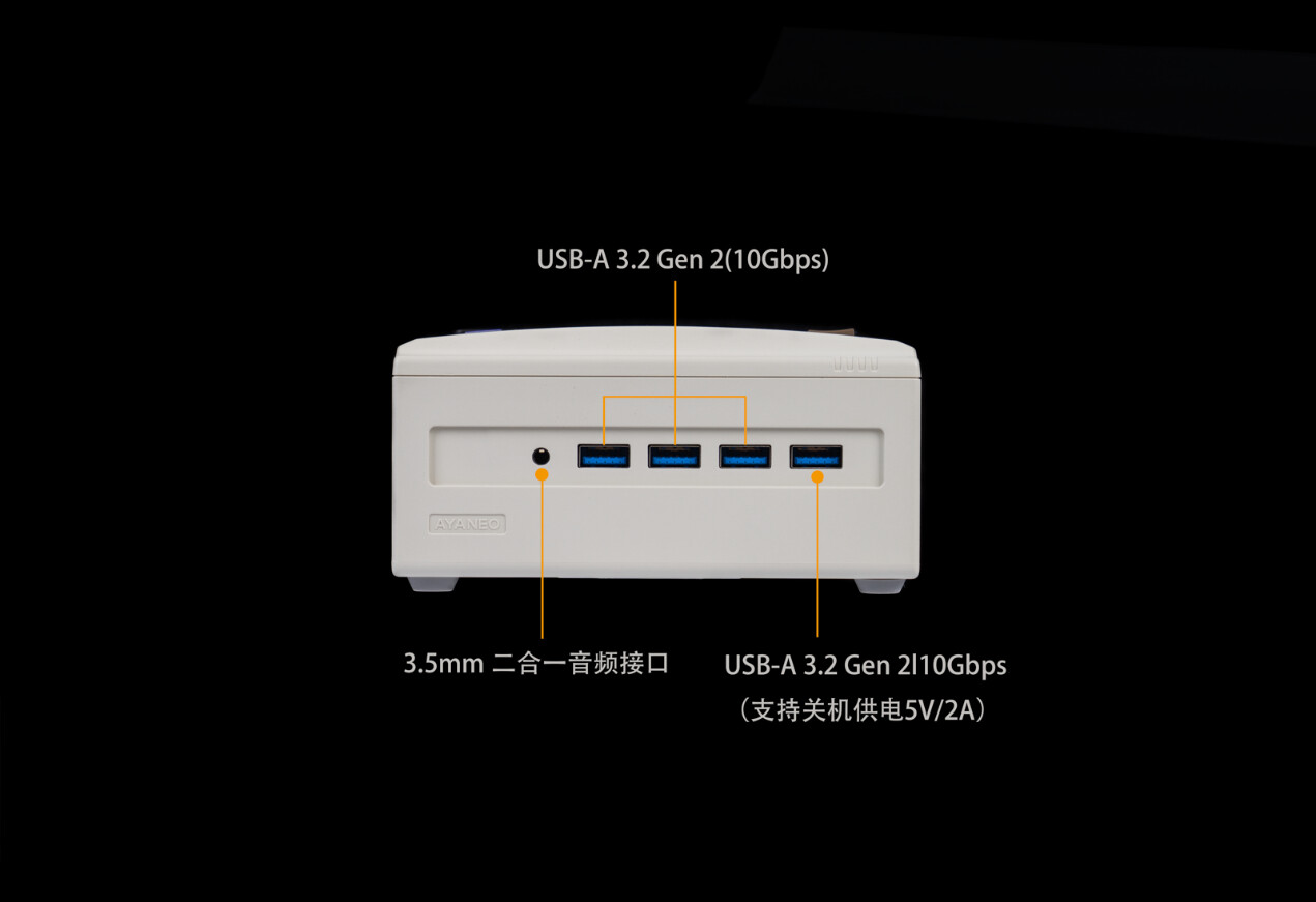 ▲AYANEO AM01S 正面集成4个 USB 3.2 Gen2 Type-A 接口(10Gbps 速率),其中1个支持关机供电,可在主机断电时为手机、耳机等设备应急充电。搭配3.5mm 二合一音频接口,满足外接耳机、麦克风的影音娱乐或办公需求。所有接口采用磁吸盖板隐藏式设计,不使用时可通过盖板遮蔽,既保持了复古机身的一体性美学,又能有效防尘。