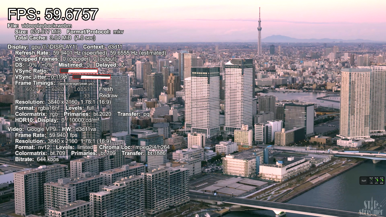 ▲AV1编码4k 60fps视频播放测试,播放流畅,帧率59.5FPS。