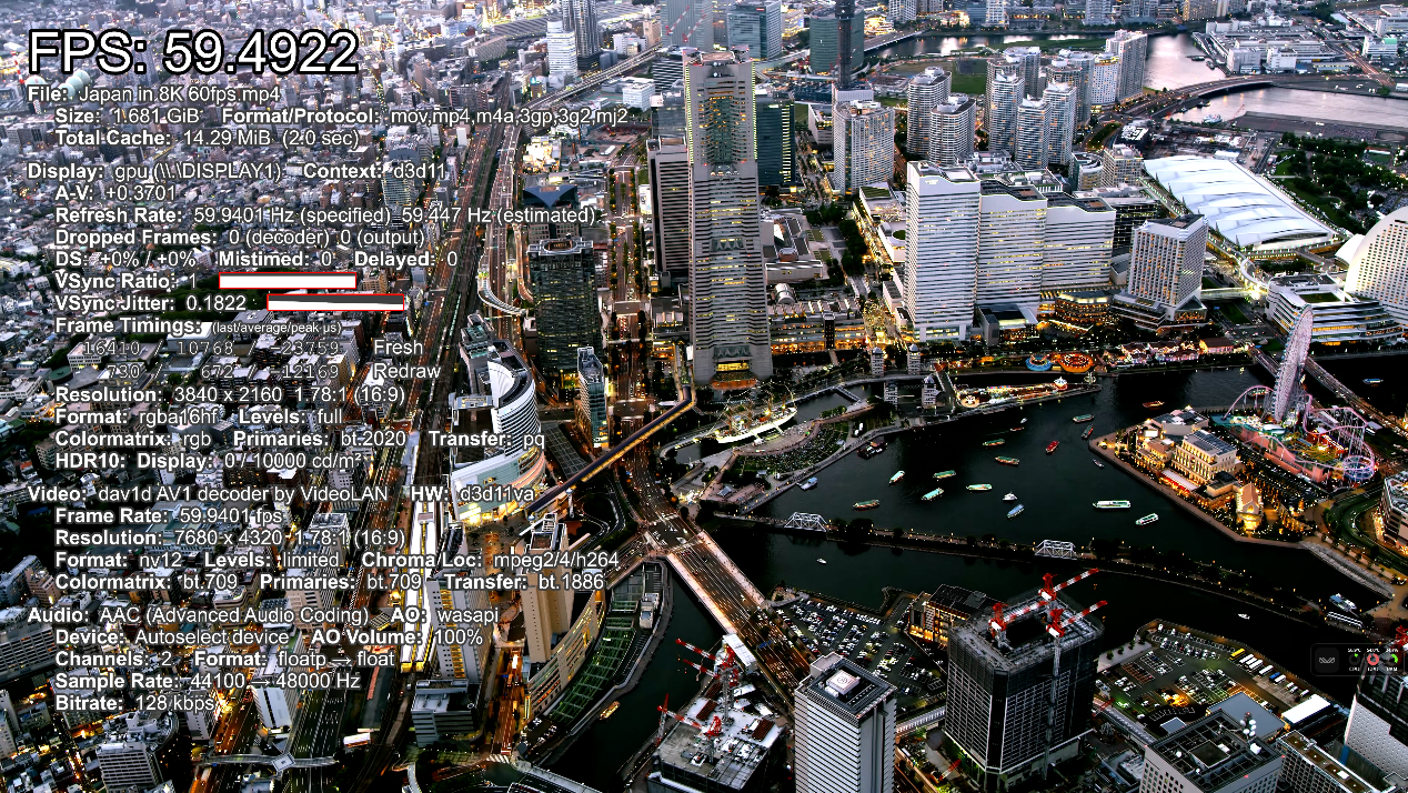 ▲AV1编码8k 60fps视频播放测试,播放流畅,帧率59.4FPS。