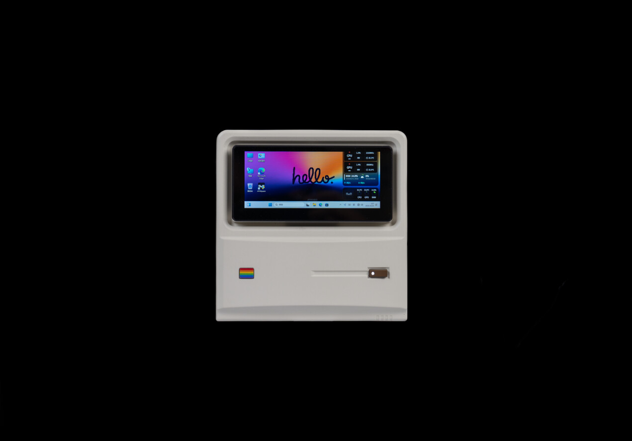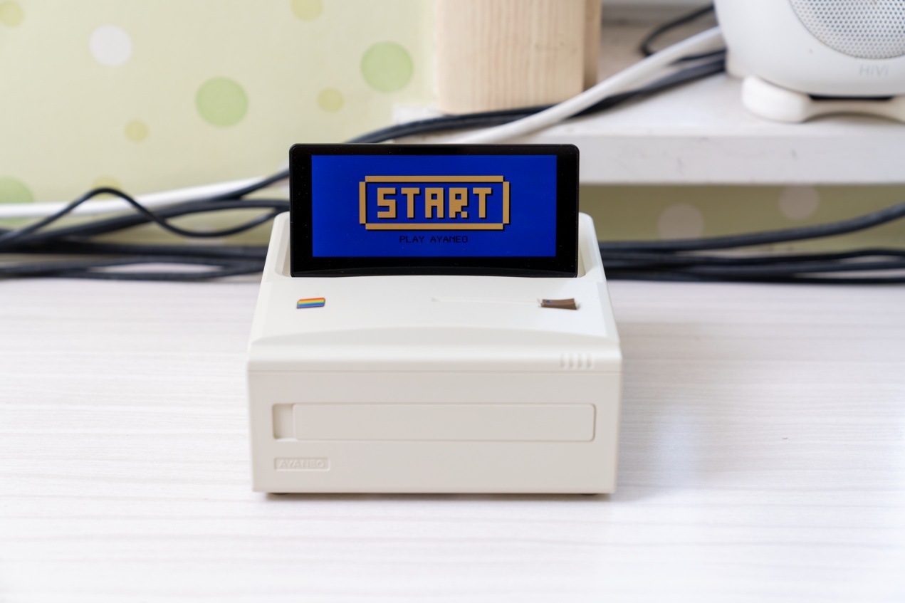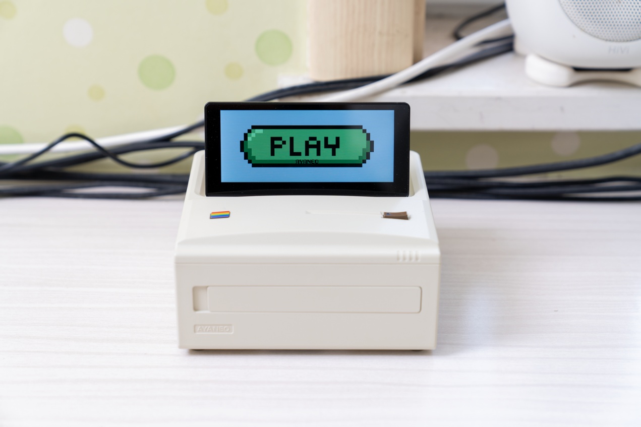 ▲AYANEO AM01S的设计灵感源自于经典电脑外观,机身正面的彩虹条装饰还原 1980 年代电脑的标志性设计,哑光白机身搭配细腻磨砂质感,134×134×59.6mm的1L体积,摆放在桌面如同一件 “可运行的复古数码手办”。