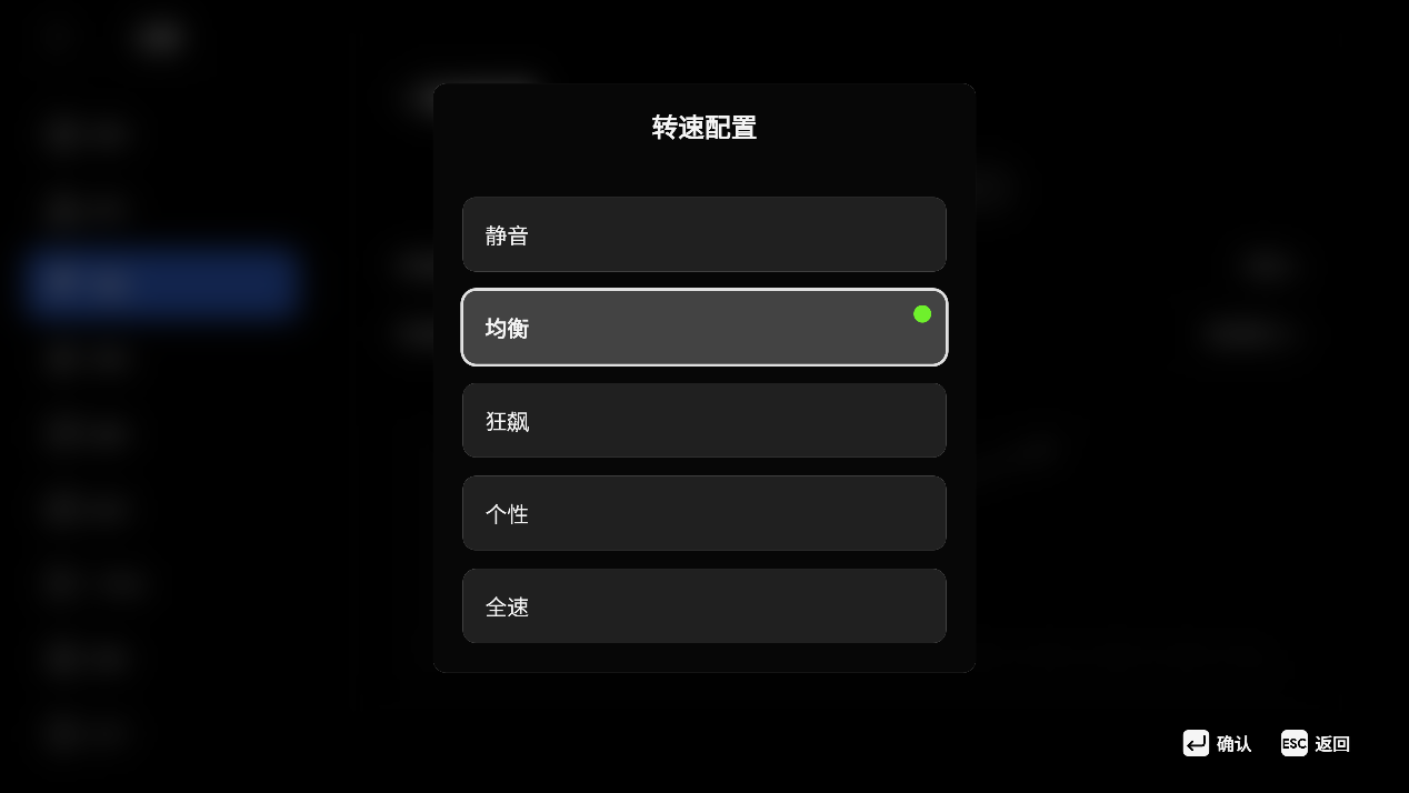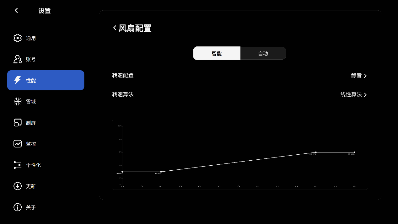▲提供 “智能”和“自动” 两大类模式。其中智能模式下细分 “静音”、“均衡”、“狂飙”、“个性”、“全速”多档策略,同时支持“转速算法”、“阶梯算法”、“线性算法”三种调节逻辑。