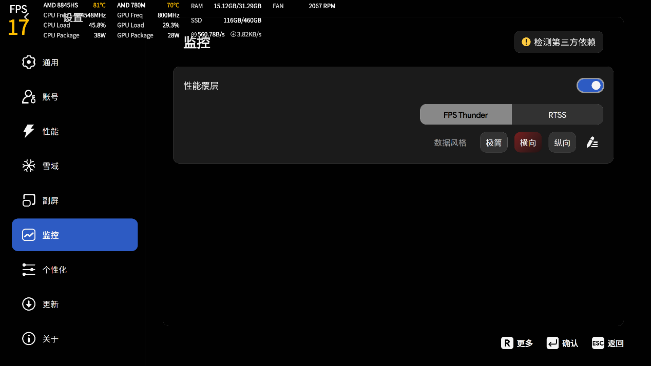 ▲监控打开性能覆层,此时所有数据都会在左上角浮动显示,可以选择不同的数据风格。