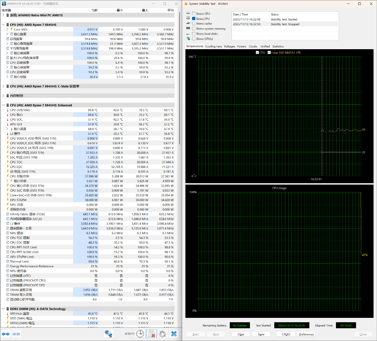▲Stress FPU 10分钟;使用HWiNFO来记录CPU温度,核心频率以及CPU功耗;整个过程持续10分钟,AMD Ryzen 7 8845HS有触发功耗墙,并达到CPU限制温度。