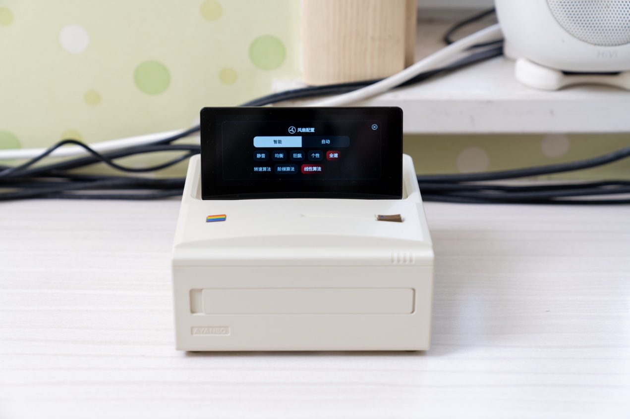 ▲灵活切换风扇配置,提供 “智能”和“自动” 两大类模式。其中智能模式下细分 “静音”、“均衡”、“狂飙”、“个性”、“全速”多档策略,从日常办公的超低噪音,到网游的满血散热需求均可覆盖;同时支持“转速算法”、“阶梯算法”、“线性算法”三种调节逻辑,玩家既能选择温度与转速的线性匹配,也能自定义阶梯式转速触发阈值,甚至通过 “个性模式” 实现风扇曲线完全自定义。这套风扇控制体系让AM01S在 “性能释放” 与 “噪音控制” 间实现精细化平衡,深夜办公可静音运行,高负载场景又能全力散热,所有调节仅需触控副屏即可一键完成。