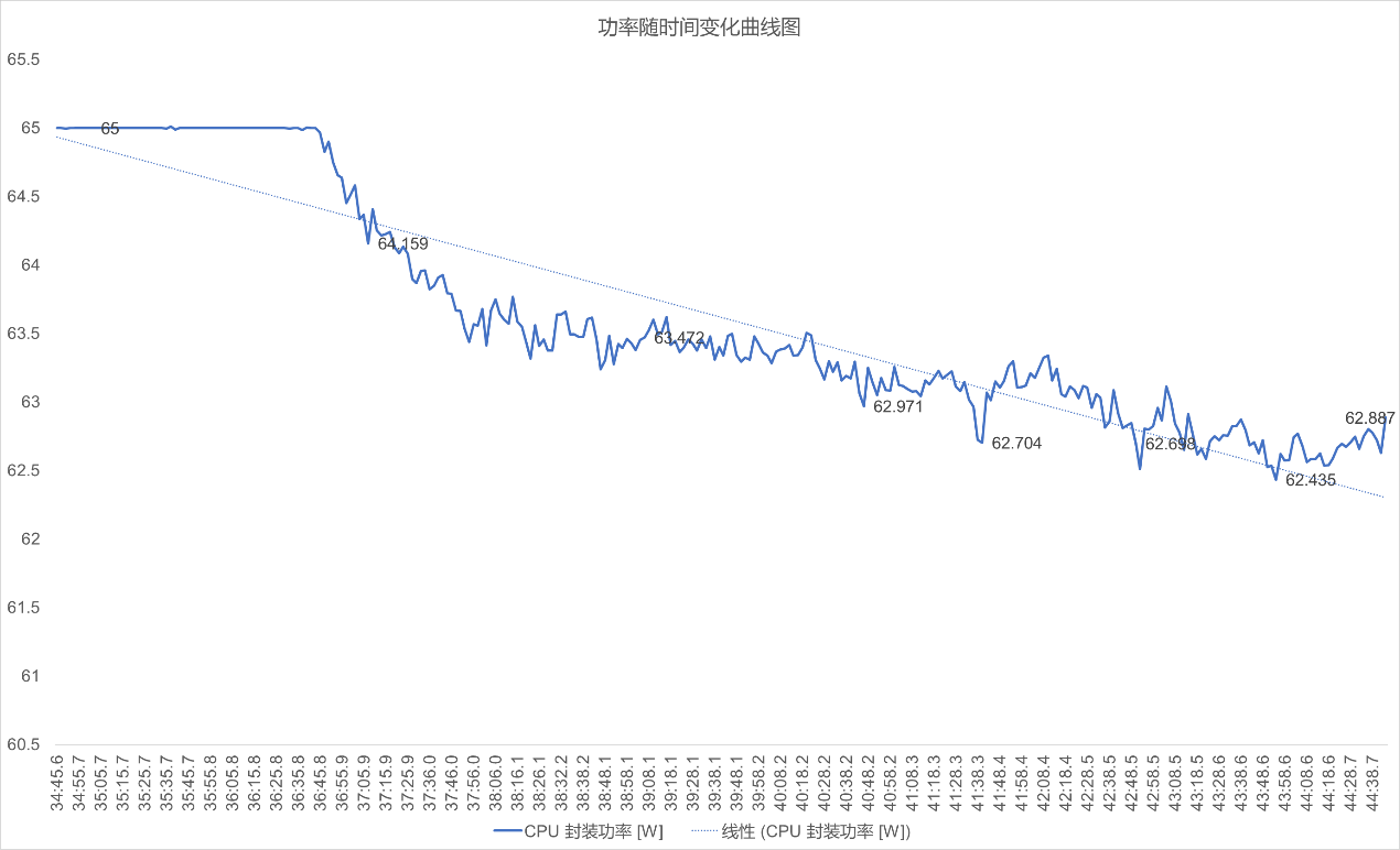 ▲由于 Thermal Limit(热限制)的存在,CPU在Stress FPU测试125秒以后,因降频策略导致功耗持续降低,初始阶段功耗稳定在65W左右,随后逐步下降并伴随小幅波动,最终维持在62.4 - 62.9W区间。