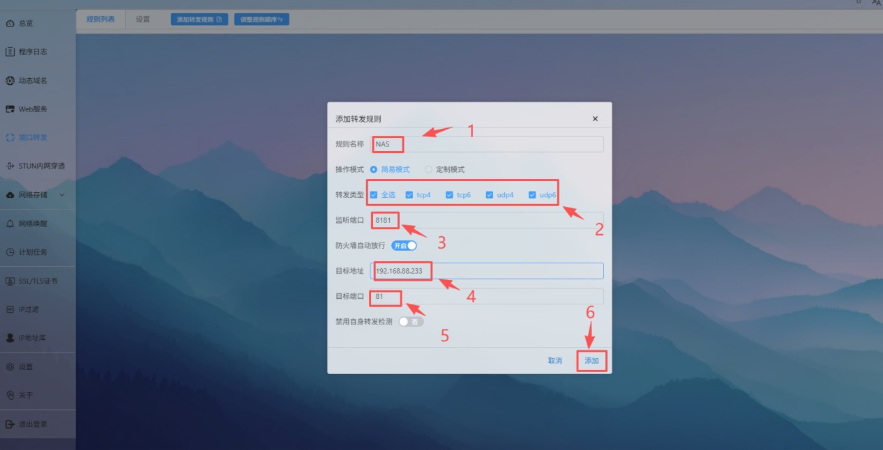 举例:如下图添加一个NAS的转发规则,分别填写其转发类型,端口号,IP地址。