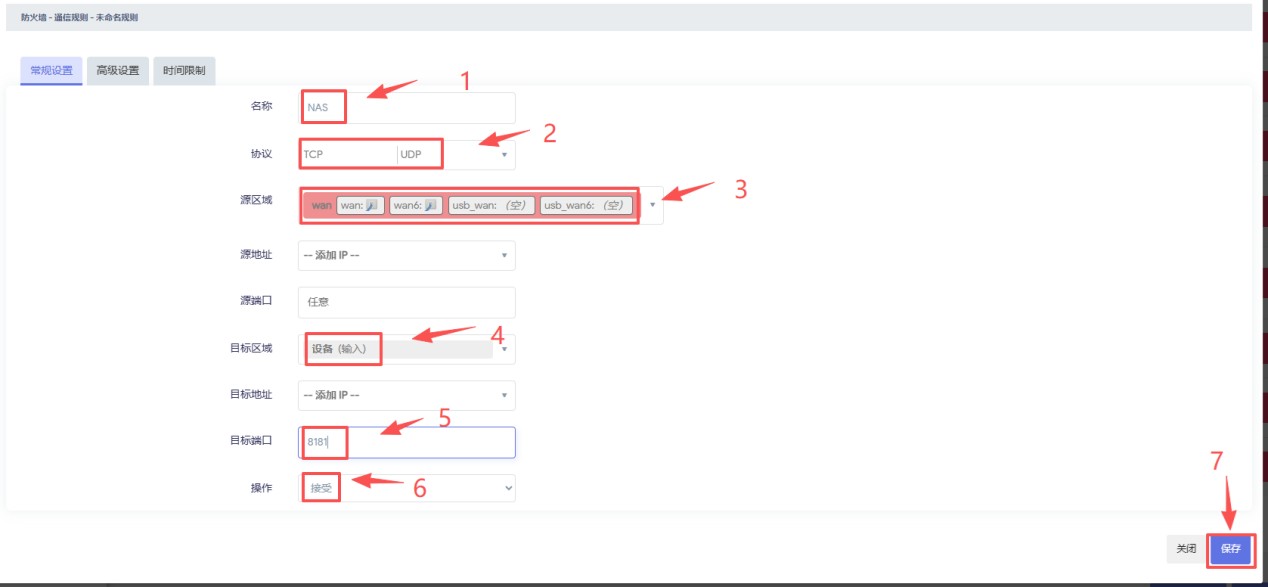 举例:如下图,填写NAS名称,选择TCP/UDP协议,源区域选择WAN,目标区域选择“设备输入”,目标端口填写lucky中的监听端口(8181),然后操作选择“接受”