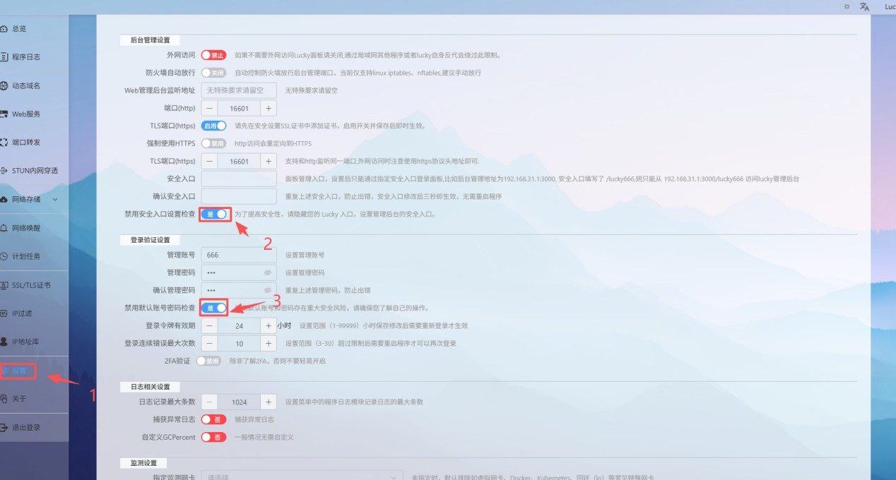4.设置:将禁用安全入口设置检查和禁用默认账号密码检查,选择开启“是”
