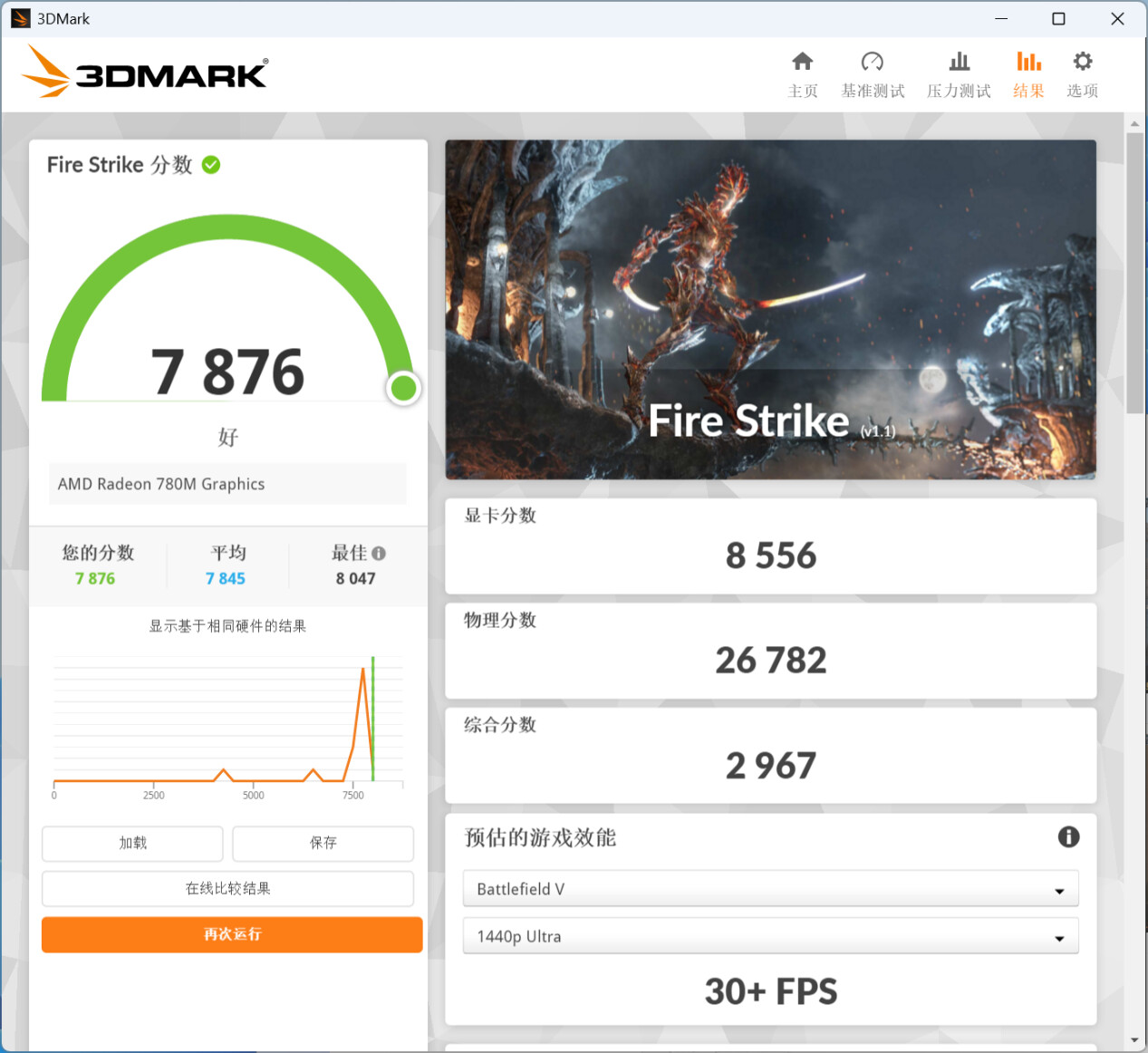 ▲3DMark Fire Strike分数7876,显卡分数8556,物理分数26782,综合分数2967。