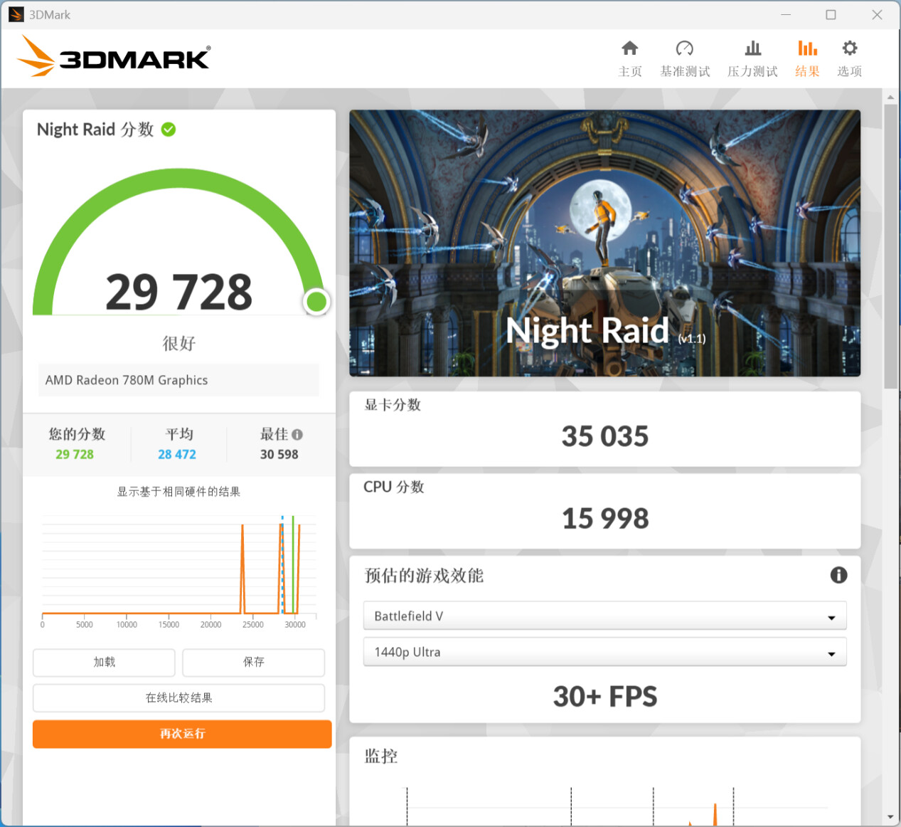 ▲3D Mark Night Raid分数29728,显卡分数35035,CPU分数15998。