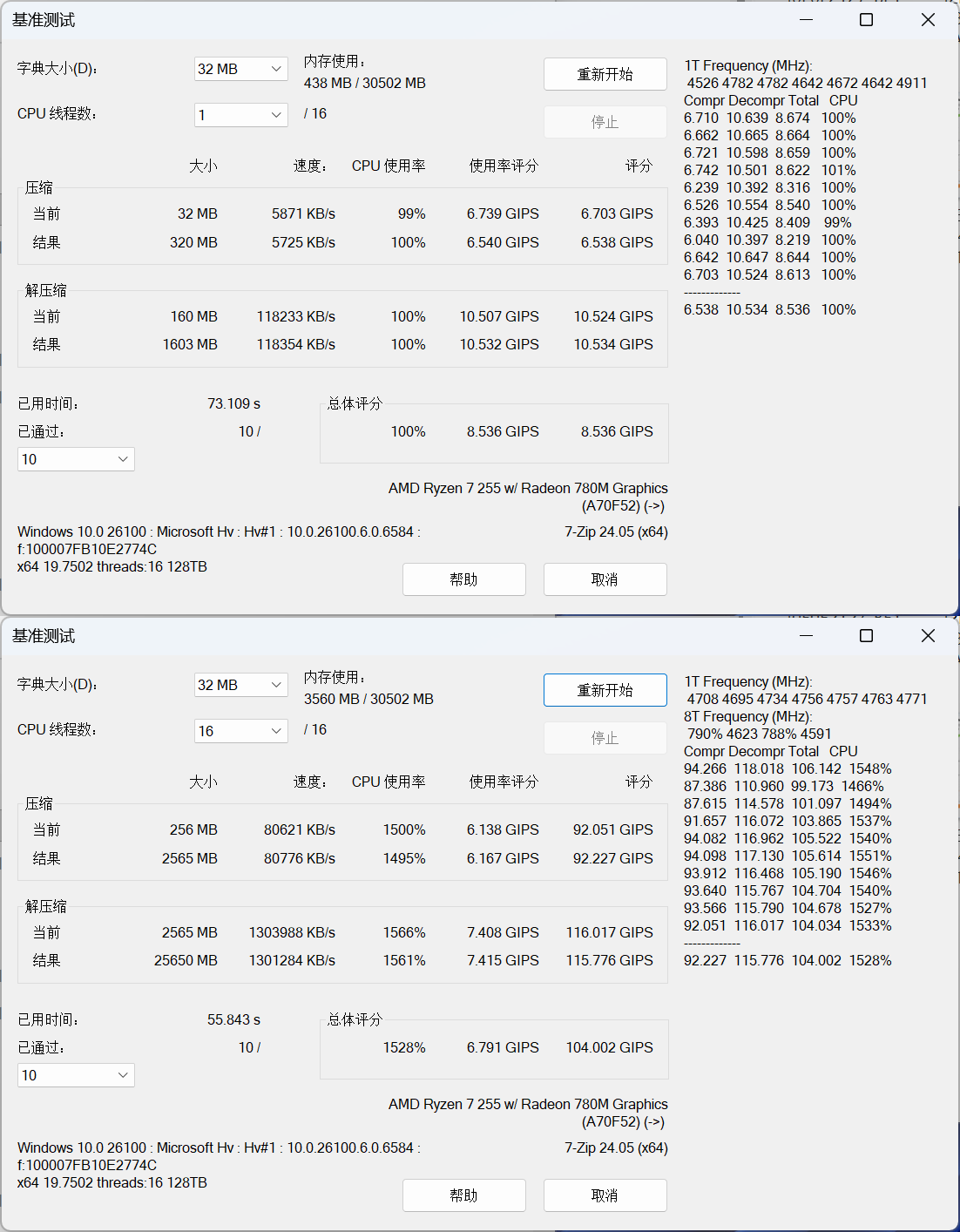 ▲7-Zip 24.05单线程和多线程测试。