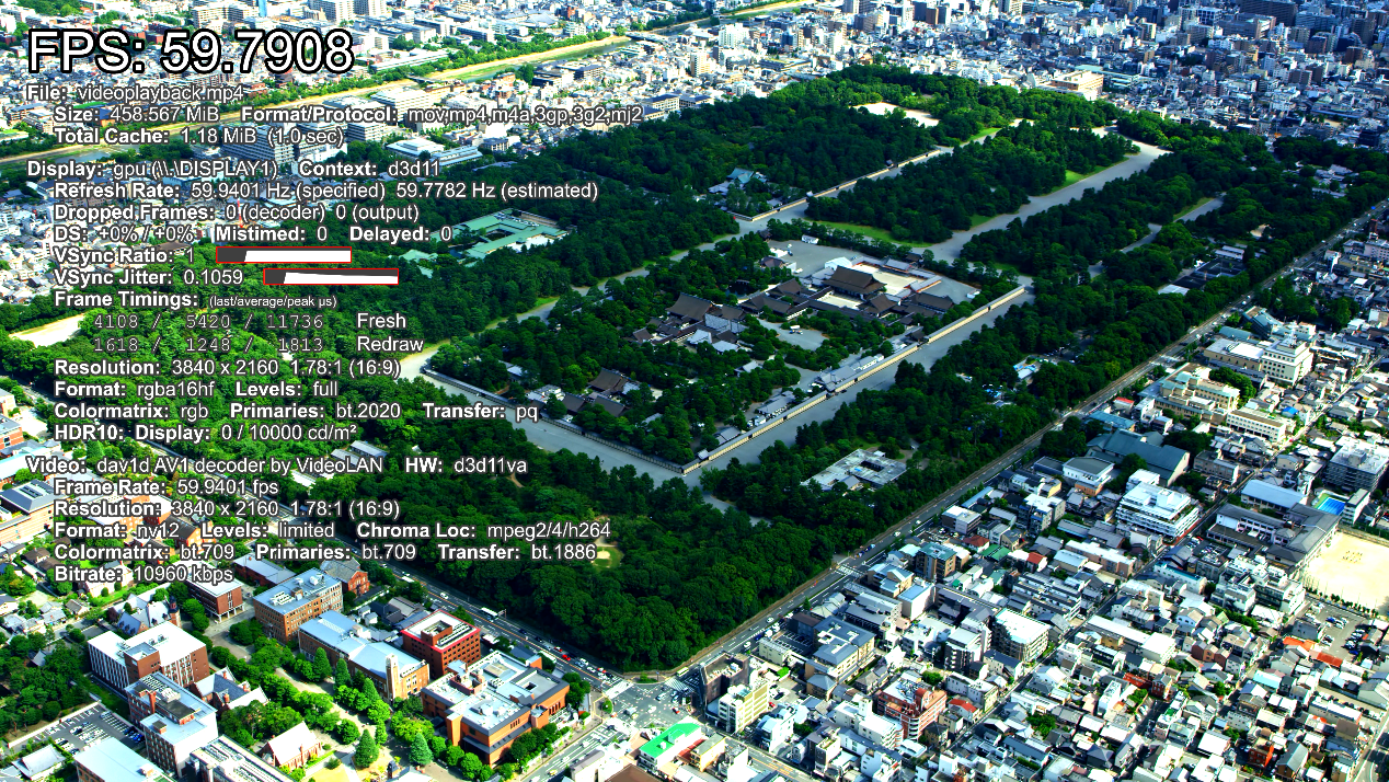 ▲AV1编码4k 60fps视频播放测试,播放流畅,帧率59.7FPS。