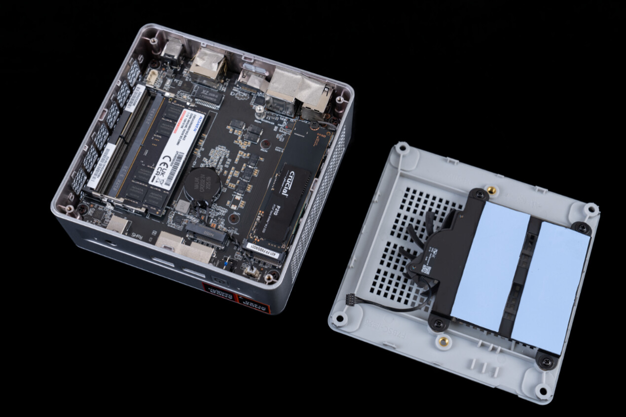 ▲打开底盖后,底盖上配备了散热风扇和导热贴,用于为SSD辅助散热;我们本次评测的 X1 Lite 255 机型,原厂预装了单条 16GB DDR5 内存,以及1TB 容量的 Crucial(英睿达)SSD。