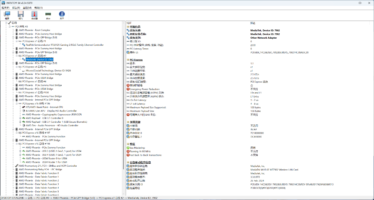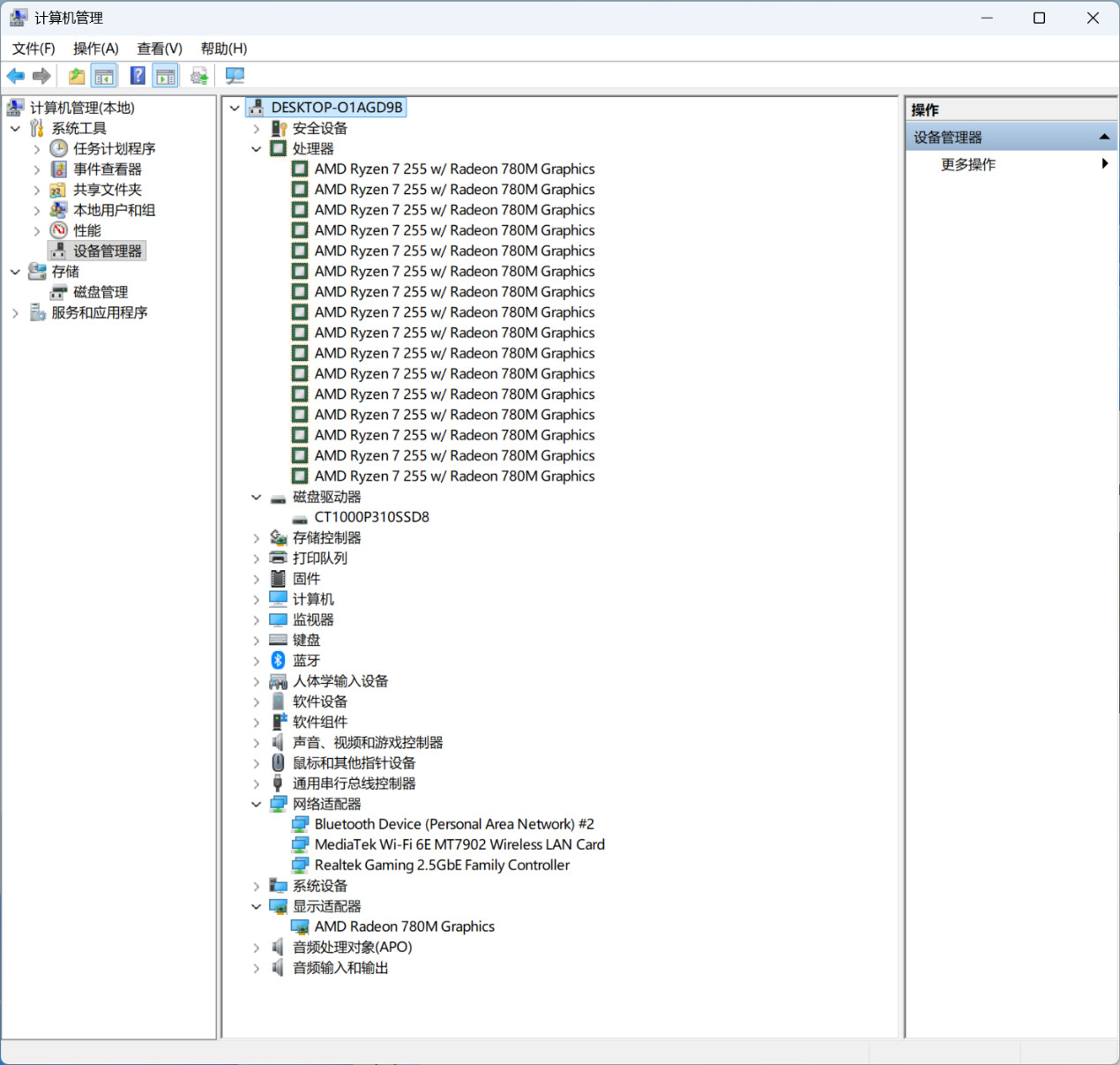 ▲设备管理器信息。无线网卡型号为MT7902,显卡型号为AMD Radeon 780M。