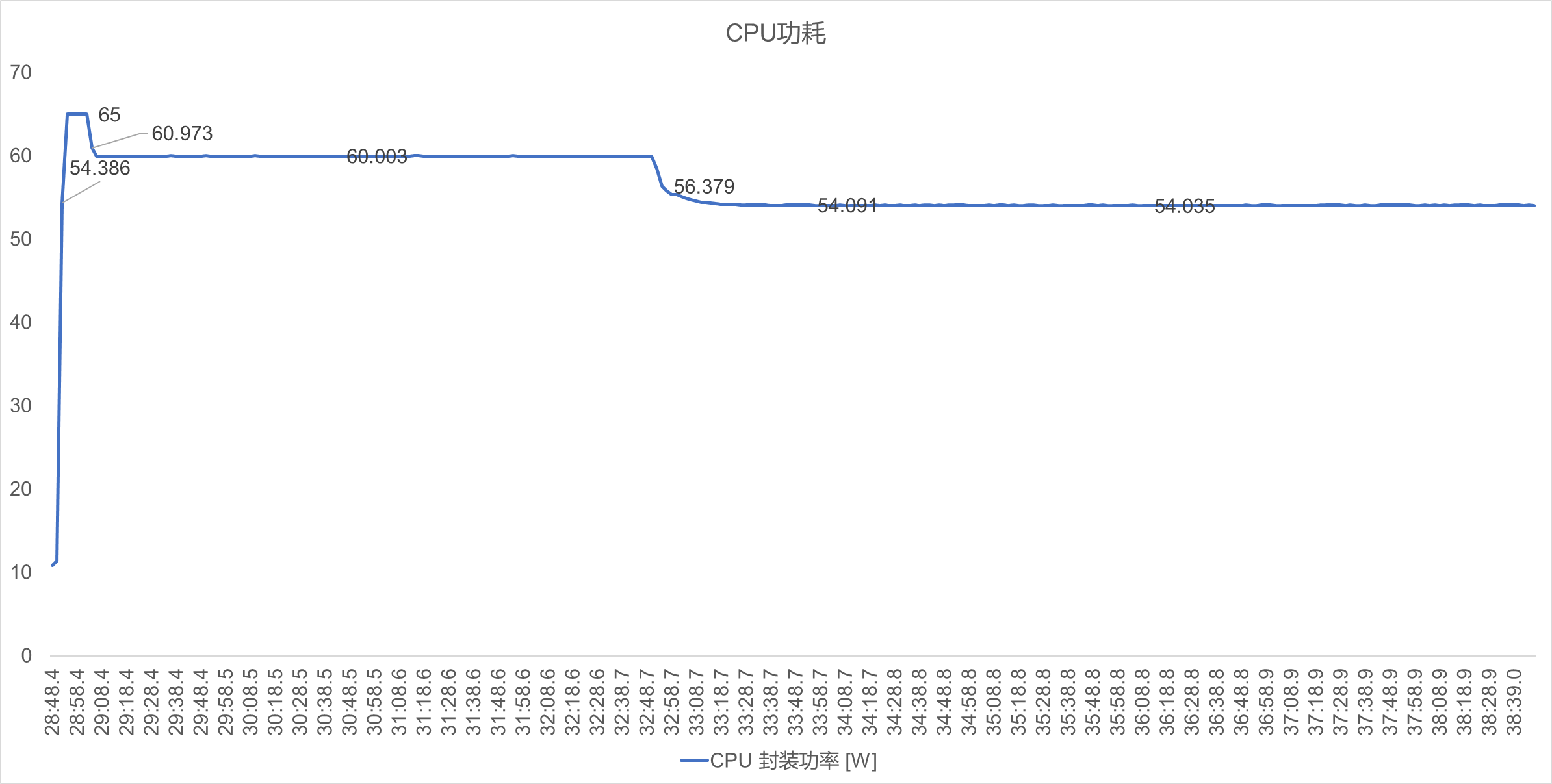 - PL1阶段(16-243秒):CPU进入PPT SLOW Limit阶段,功耗在60W附近,维持在一个相对稳定的运行状态。