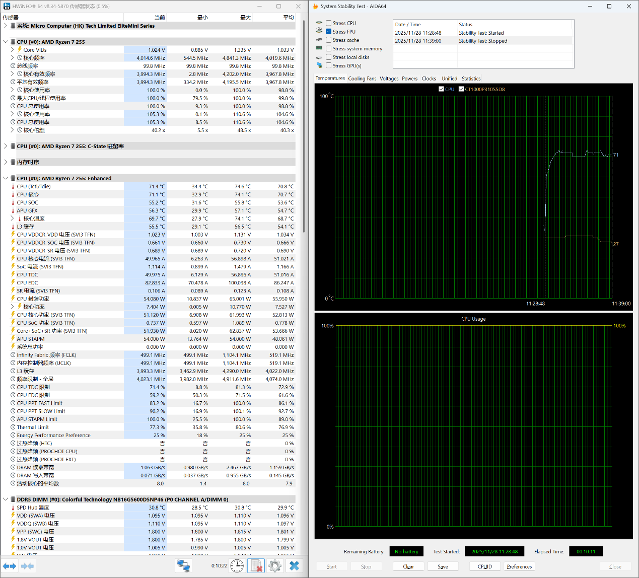 ▲Stress FPU 10分钟;使用HWiNFO来记录CPU温度,核心频率以及CPU功耗;整个过程持续10分钟,AMD Ryzen 7 255有触发功耗墙,但没有触发温度墙。