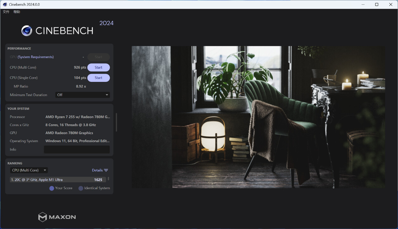 ▲CINEBENCH 2024测试,单核心分数为104pts,多核心分数为926pts。