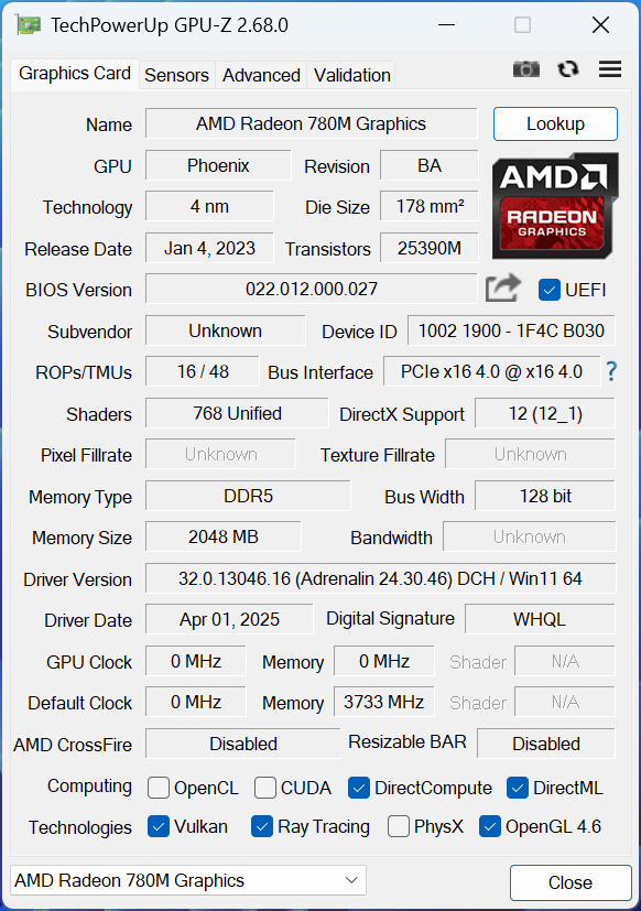 ▲GPU-Z信息,AMD Ryzen 7 255 CPU集成的AMD Radeon 780M显卡具备16ROPs。