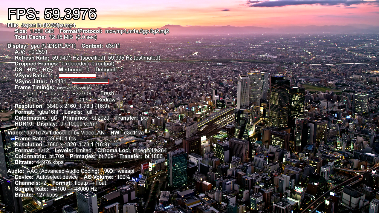 ▲AV1编码8k 60fps视频播放测试,播放流畅,帧率59.3FPS。