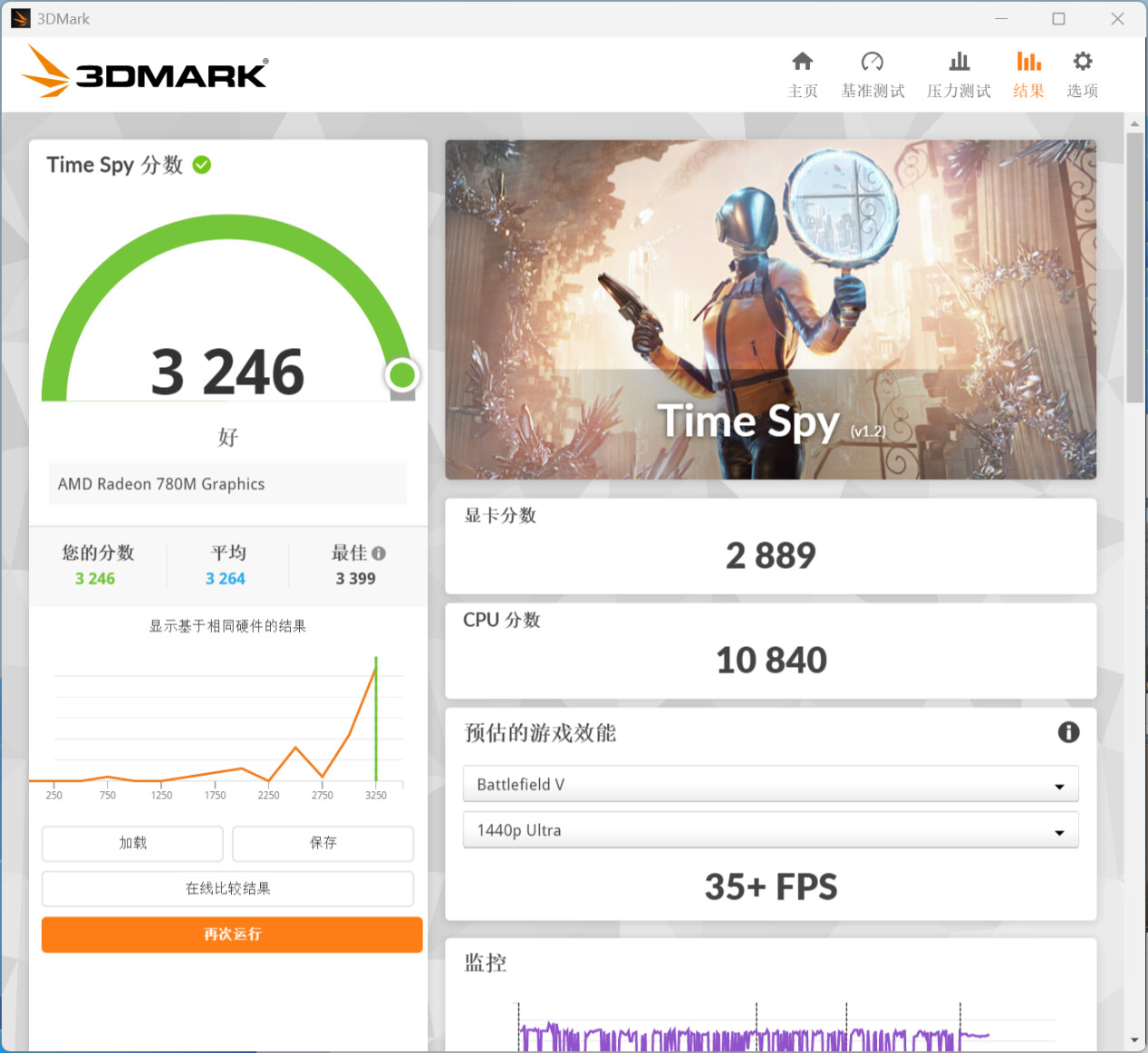 ▲3DMark Time Spy分数3246,显卡分数2889,CPU分数10840。