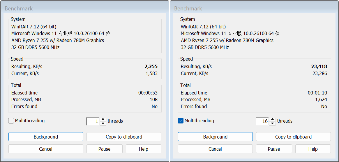 ▲WINRAR 7.12单线程和多线程测试。