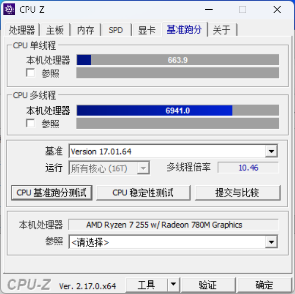 ▲CPU-Z测试分数;单线程663.9,多线程6941.0。