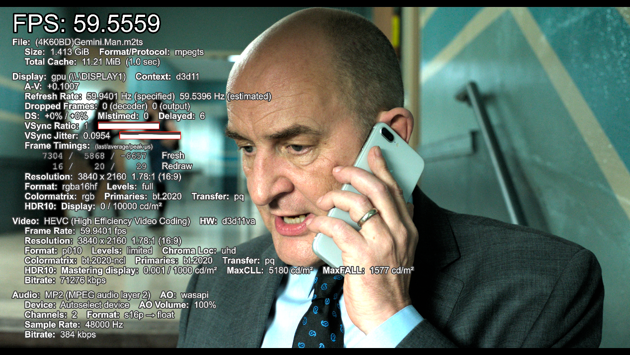 ▲hevc编码4k 60fps视频播放测试,播放流畅,帧率59.5FPS。