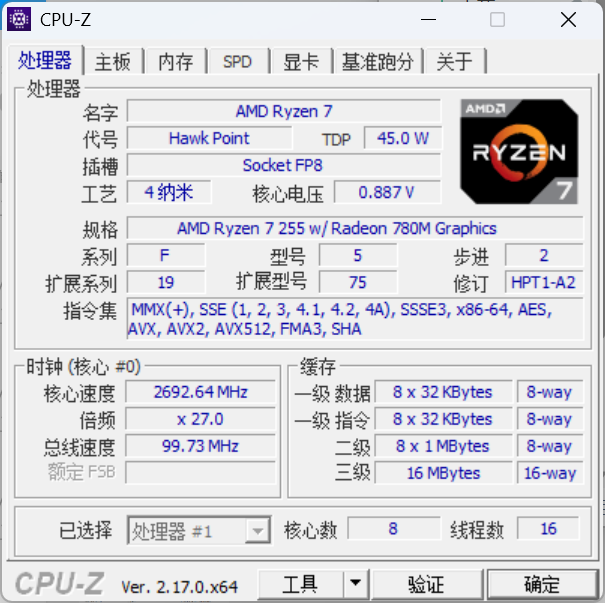 ▲CPU-Z信息;AMD Ryzen 7 255 CPU具备8核心16线程。