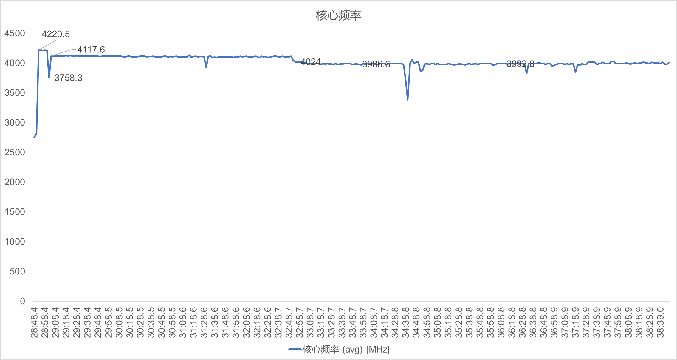 - 初始阶段(0-6 秒):CPU核心频率快速上升,接近4.22GHz。