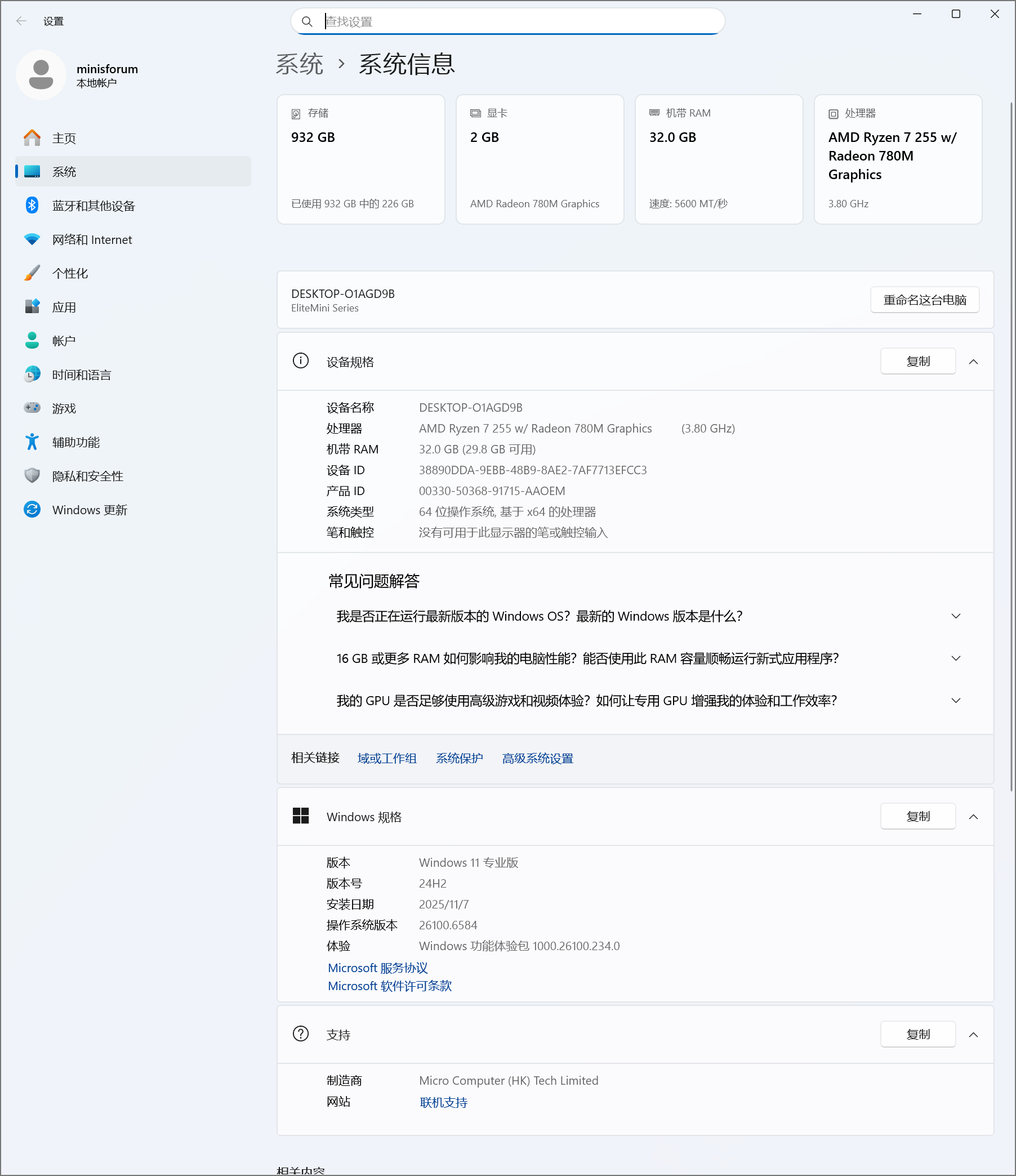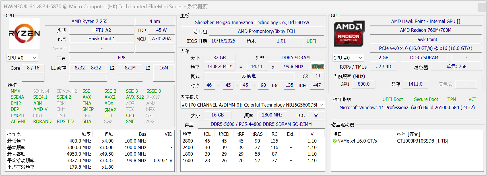▲X1 Lite 255搭载了AMD Ryzen 7 255 CPU,配备32G DDR5-5600MHz内存,预装Windows 11专业版。