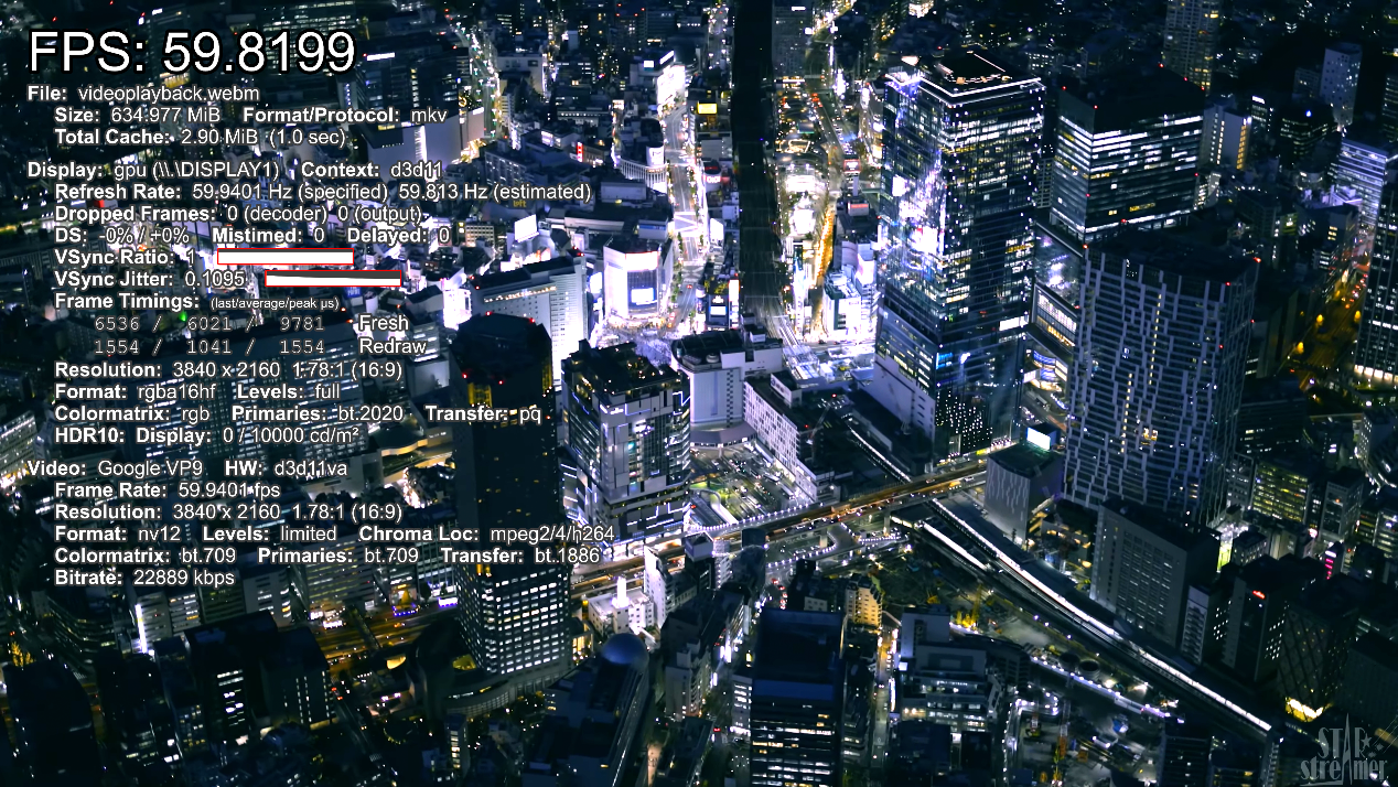 ▲VP9编码4k 60fps视频播放测试,播放流畅,帧率59.8FPS。
