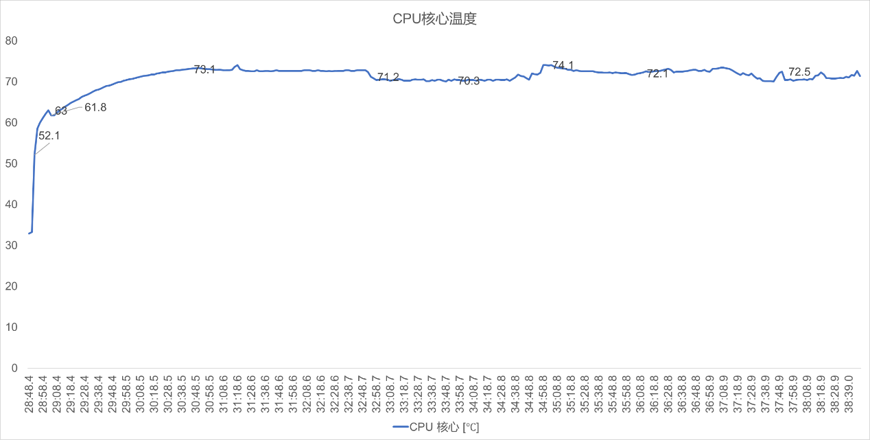 ▲在 Stress FPU高压力测试全程中,CPU核心温度峰值未超过75℃,始终保持在安全稳定的区间内波动,设备散热系统的温度控制表现十分优秀。