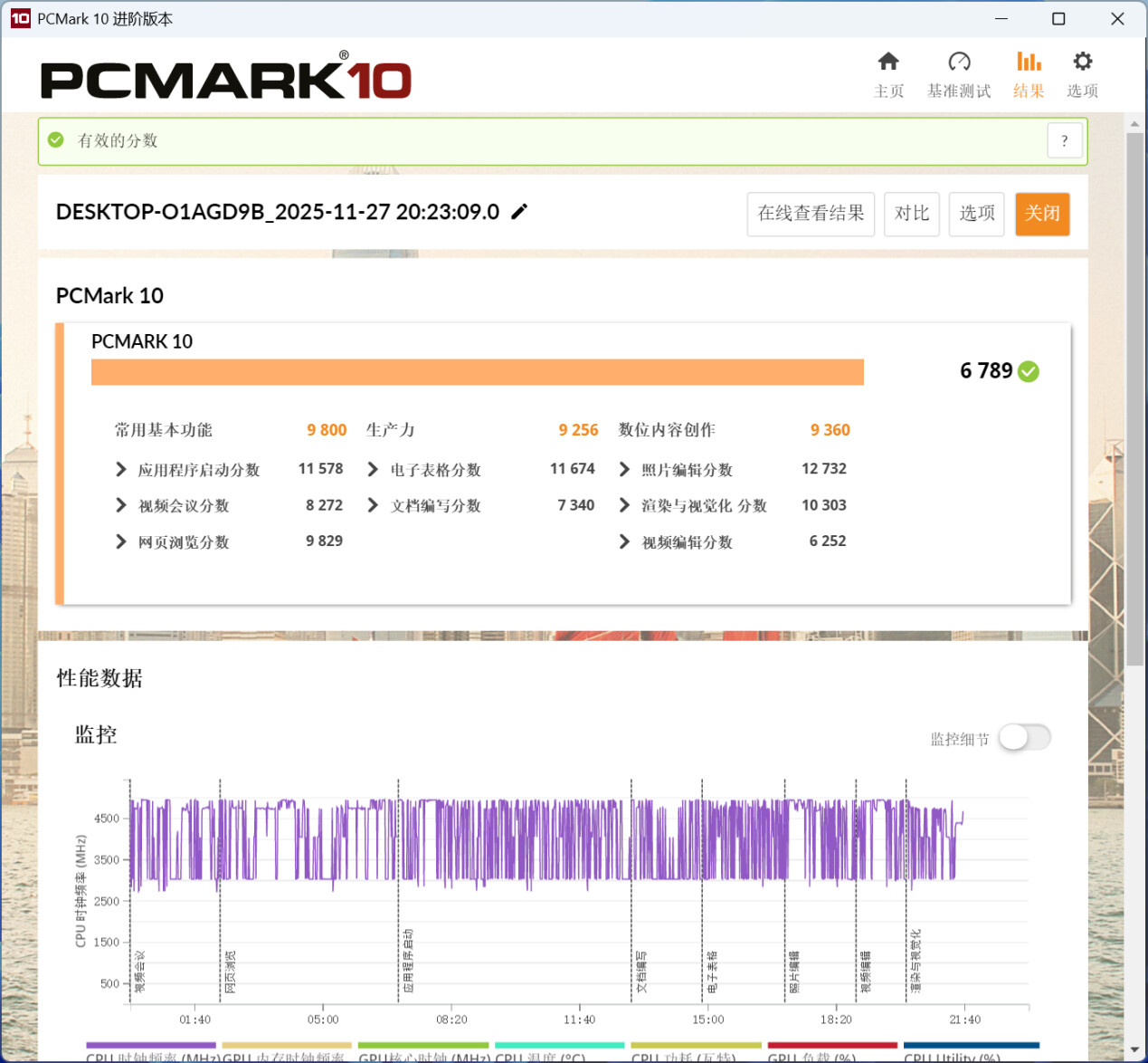 ▲PCMARK 10分数6789;常用基本功能得分9800,生产力得分9256,数位内容创作得分9360。