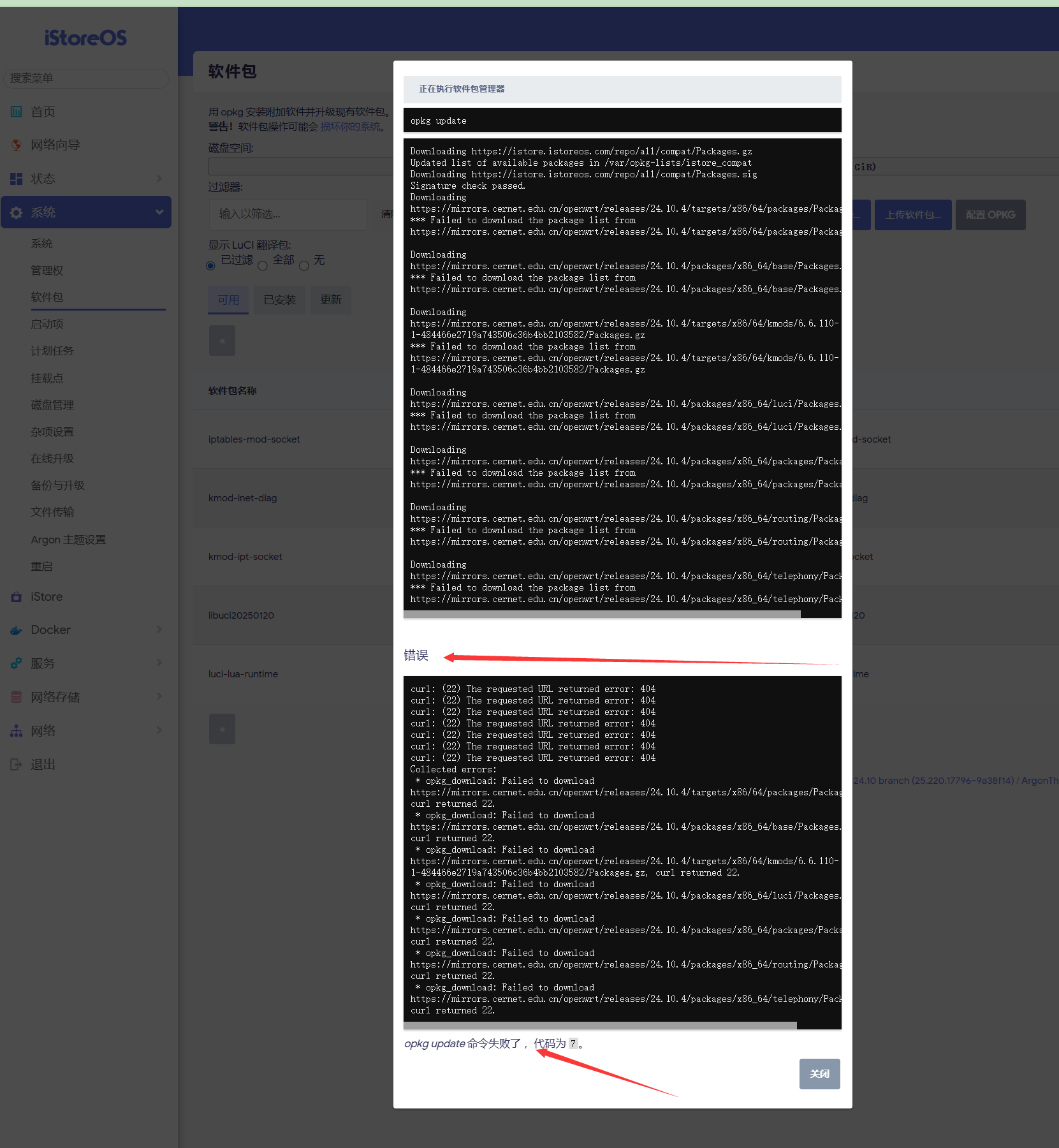 最新版iStoreOS更新软件失败,手动安装软件也不行,是什么问题呢?