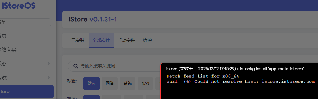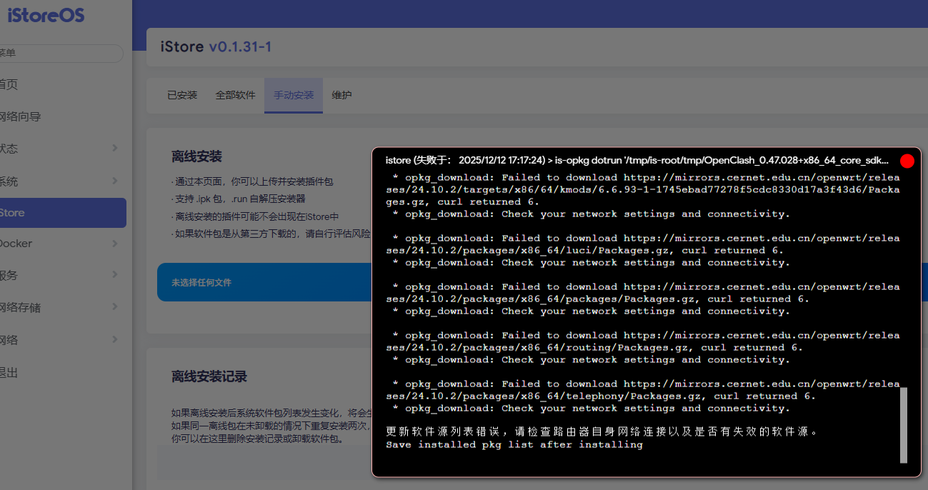 iStore v0.1.31-1无法在线安装软件,离线安装包也不行