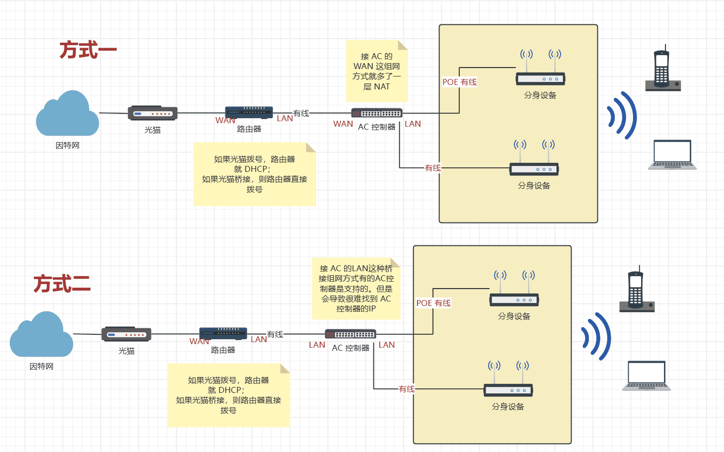 让 AC 做桥接模式(连接 AC 的LAN,关闭 AC 的DHCP)。这种部分 AC 可能不支持,需要自己单独测试,特别要测试下漫游再使用。