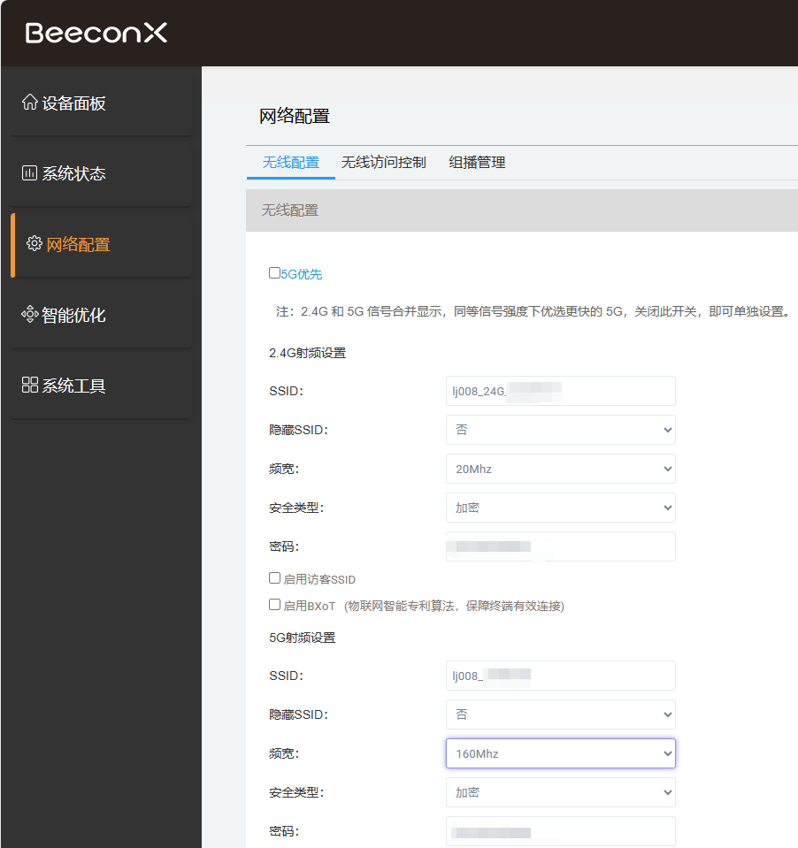 然后就可以修改 SSID 跟密码了。建议把 5G 跟 2.4G 无线分开。